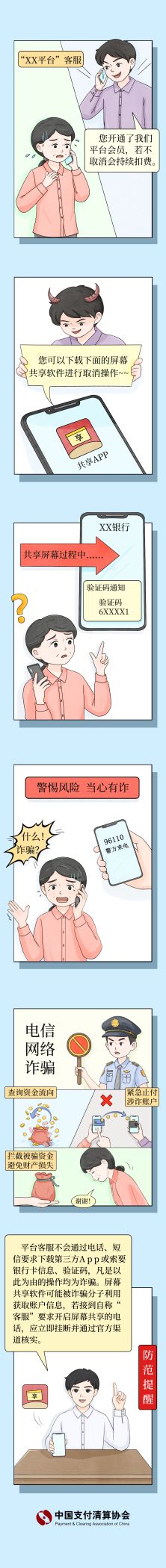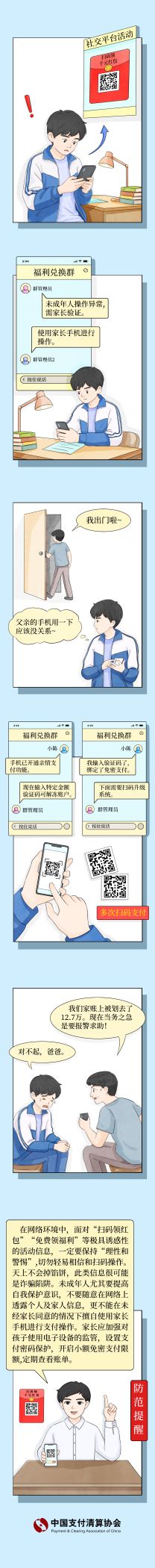 中国支付清算协会持续跟进涉诈资金转移新形势、新特征、新变化,汇集监管部门、会员单位和互联网络发布的相关反诈案例素材,聚焦老年人、青少年、网购人员群体,编写并制作《电诈典型案例及风险防范》系列漫画,帮助人民群众提升风险防范意识和识诈反诈能力。
